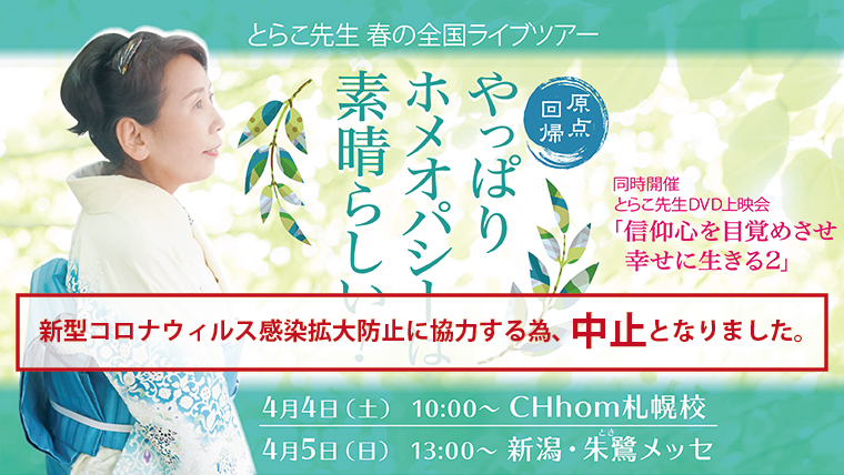 ●とら子先生3時間講演ありがとうございました。ホメオパシー、薬に頼らず自分自身の力で治癒していく療法にとても感動をうけました。とら子先生が講演して下さる言葉そしてまたその言葉に対する背景がうかび涙する場面がいくつもありました。心・体・魂 三位一体である事を忘れず、そして、ご先祖先に感謝、手を合わす事もおこたらず、日々感謝して、自分を許しそして自分をほめ続けたいです。