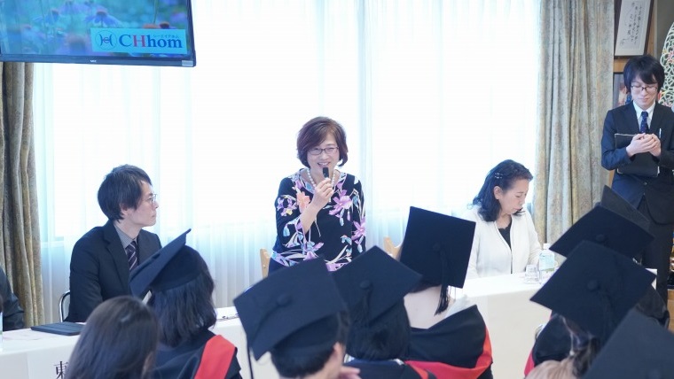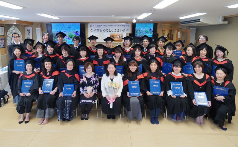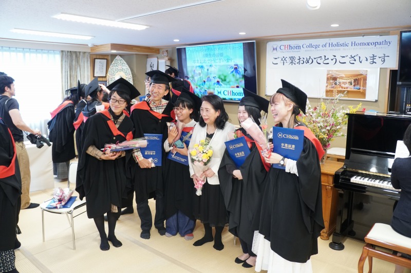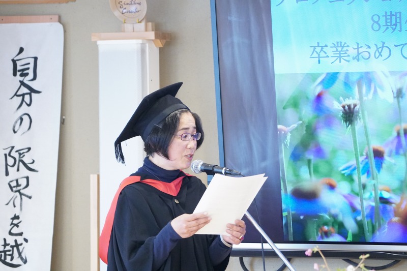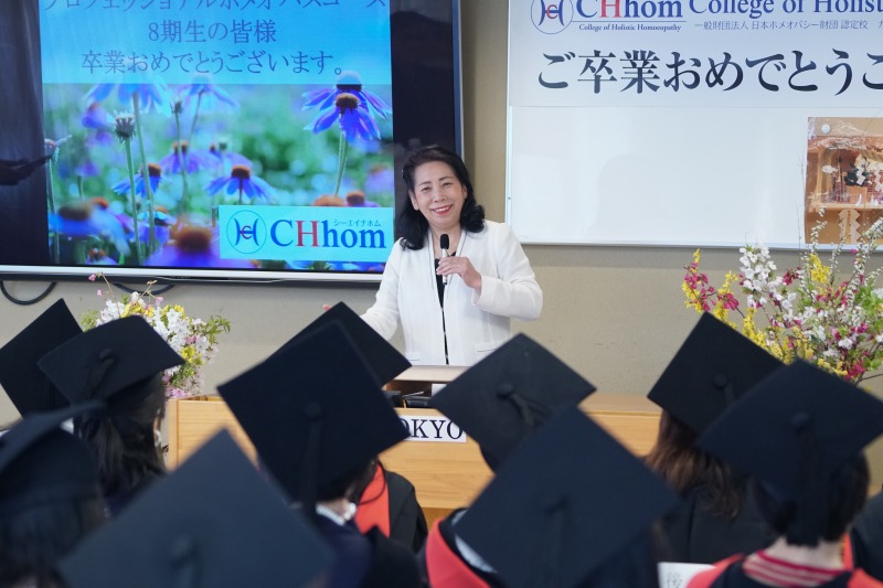 卒業生総代による挨拶では、4年間での体験談をお話頂きました。お話の中で、とうとう自分の生きる道を探し求めようと行きついた末、CHhomにたどり着いたそうです。CHhomの生きる哲学によって、長い間母親を好きになれず自分を責めて抜いて来た自分、そして母に「よくぞここまで育ててくれた」と感謝することが出来るようになり、学びを通して救われたとのことです。CHhomでの学びはホメオパシーの技術を学びながら、人間形成をする場でもあります。壇上を見守る他の参列者も、琴線に触れ、大きく心動かされているようでした。
