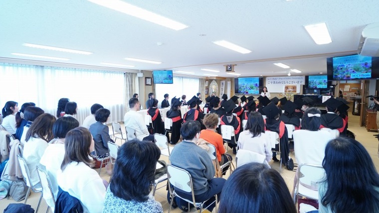 開式に先立ち、学生時代最後となる祝詞と般若心経を奏上、国歌斉唱の後、学生たちに惜しみなく愛情と知恵を授けてくださった、由井学長による挨拶から始まりました。4年間頑張って学んで来られた学生の皆様へ由井学長より温かい労いの言葉が贈られ、そして由井学長からの最後の教えとして、魂のホメオパスにとって信仰心の大切さや霊性を高めるためのアドバイスが伝えられました。また思い出のエピソードや、はなむけの言葉、愛に満ちたメッセージが贈られました。