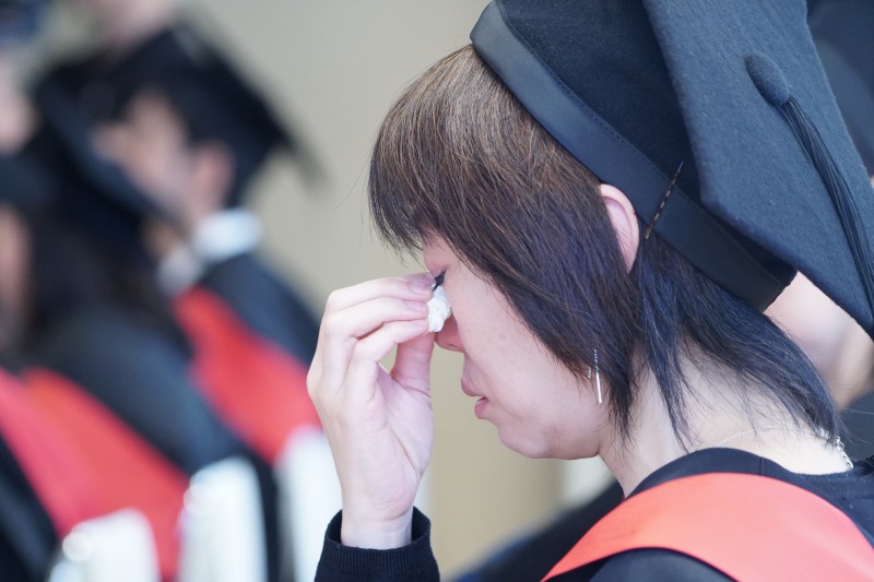 由井学長は4年間頑張ってきた卒業生に愛情をもって一人ひとりに声をかけ、抱擁し、あるいは卒業生の手をとって喜びを分かち合いました。本当に晴れやかな表情を見せる方や、この4年間のさまざまな出来事が思い出されるのか、涙があふれてとまらなくなる方もいらっしゃいました。