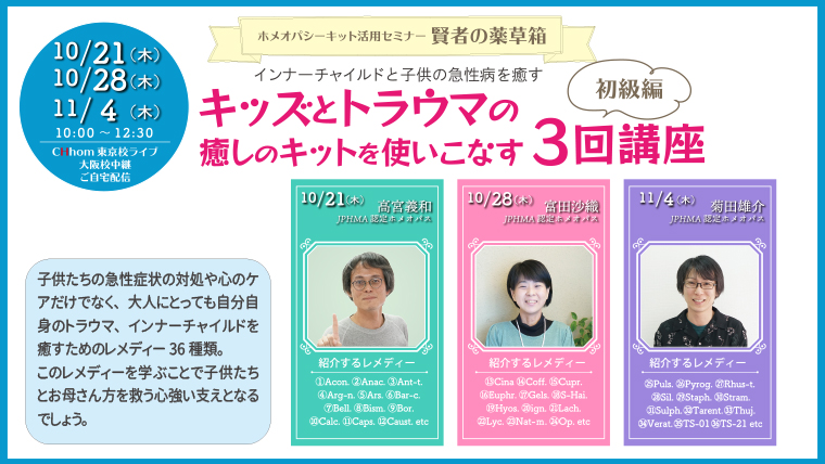 子供たちの急性症状の対処や心のケアだけでなく、大人にとっても自分自身のトラウマ、インナーチャイルドを癒すためのレメディー36種類。 このレメディーを学ぶことで子供たちとお母さん方を救う心強い支えとなるでしょう。 ライブ会場(東京校)、中継会場(...