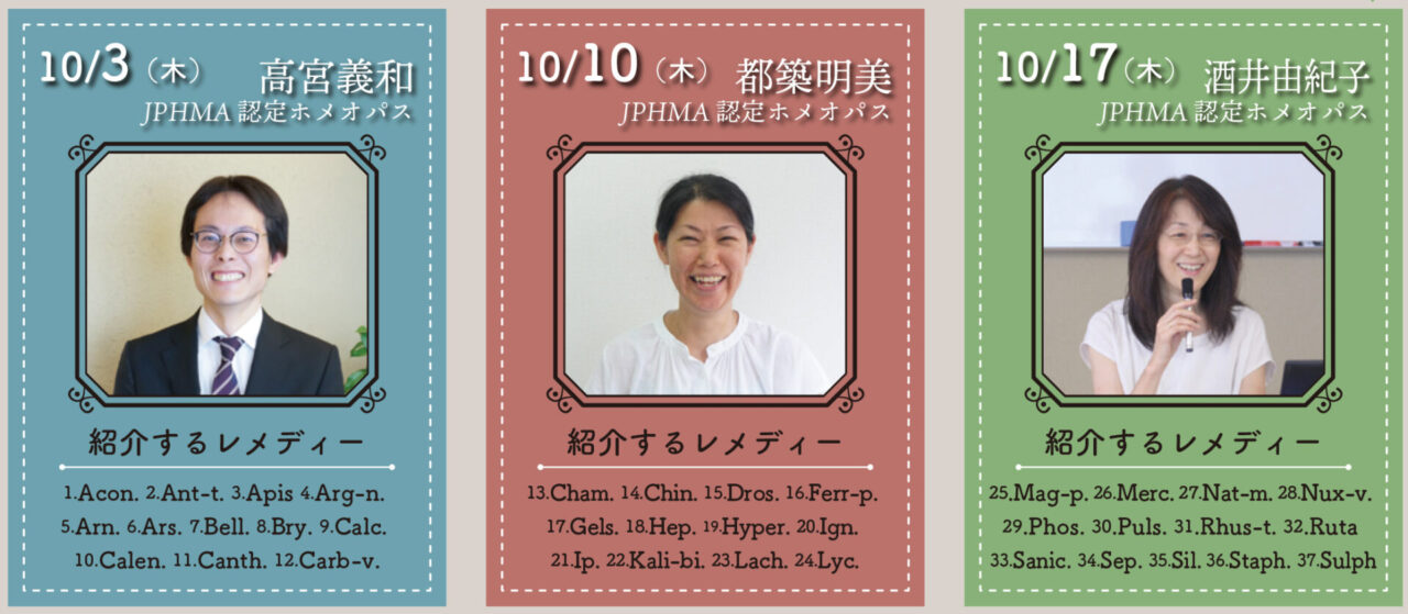 10/3(木)・10(木)・17(木) 〜賢者の薬草箱シリーズ〜【東京ライブ・全国中継】 〜賢者の薬草箱シリーズ〜 「基本のホメオパシーキットのレメディーを学ぶ3回講座」 【1回目】講師:高宮義和JPHMA認定ホメオパス 【2回目】講師:都築明美JPHMA認定ホメオパス 【3回目】講師:酒井由紀子JPHMA認定ホメオパス 〜...